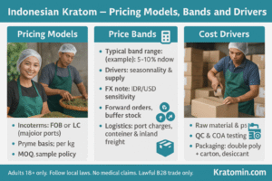 Define the band. Pick the Incoterm. List drivers and attach proof. With that discipline, Indonesian kratom pricing remains stable and easy to explain.