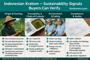 See Indonesian kratom sustainability signals buyers can verify. Use trace steps, farm records, handling logs, COAs with method notes, and time-stamped photos to support compliant claim language. Kratomin.com structures evidence, document cadence, and audit-ready packs for lawful destinations only. No medical claims.